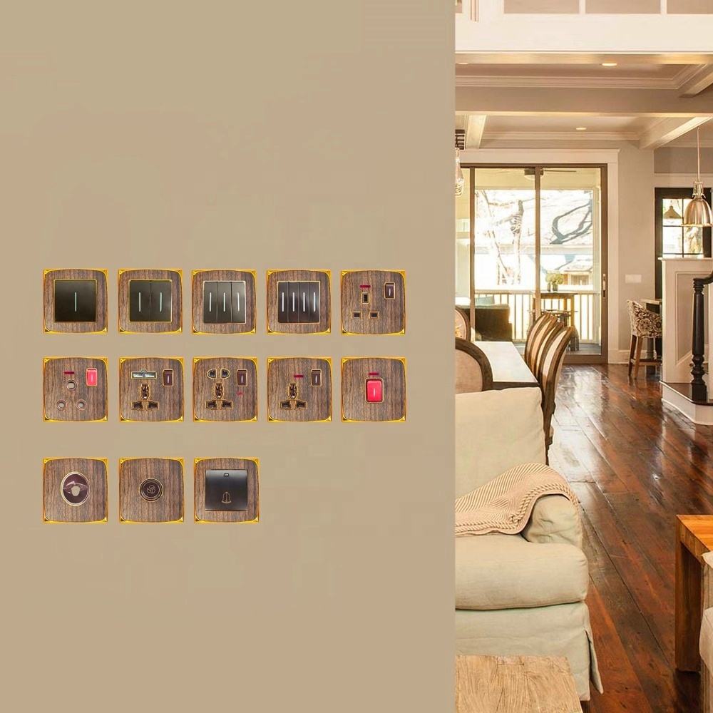 Home / Product / A113,A114 Series( PC Matte Wooden Gold Design) / PC 3 Gang 1 Way Wood Color Light Electrical On Off Wall Switch
