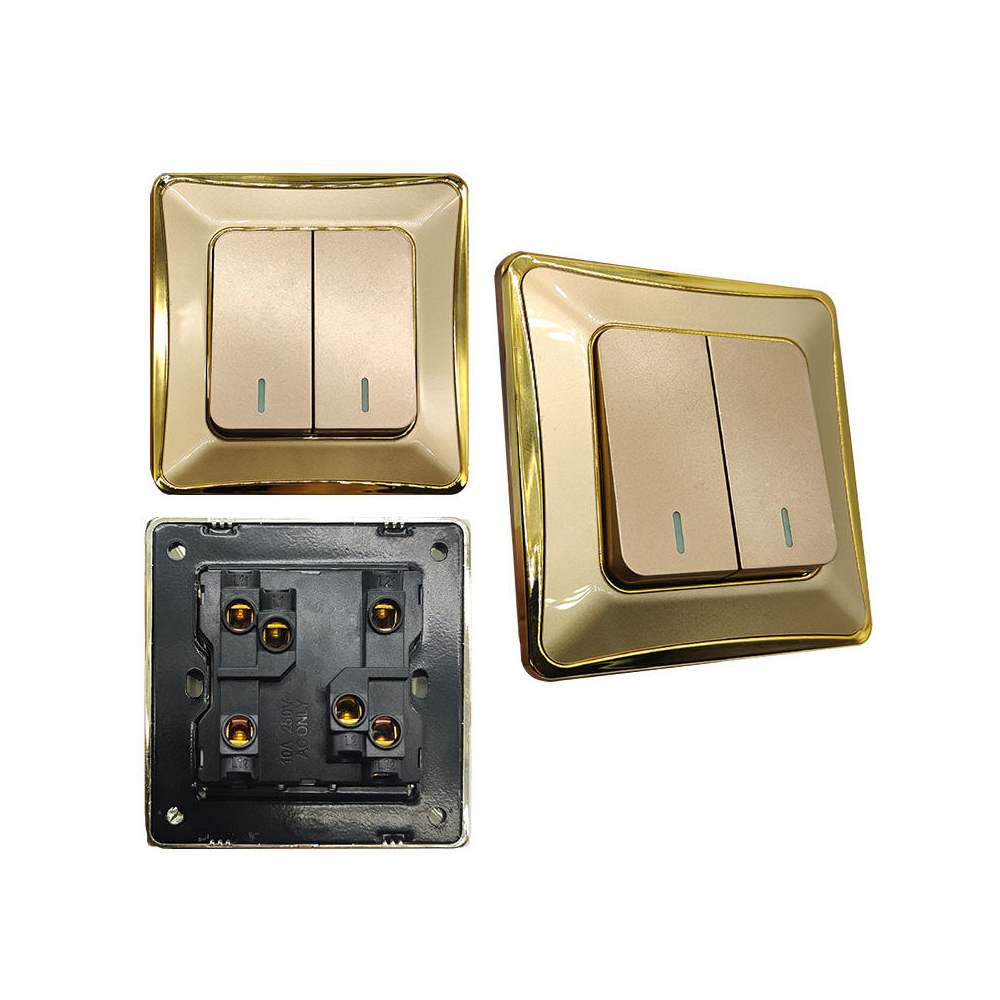 Home / Product / A132,A133 Series( PC Heat Bending Golden Design) / Wall Switch And Socket 2 Gang 1 Way Wall Switch 10a Light Switch